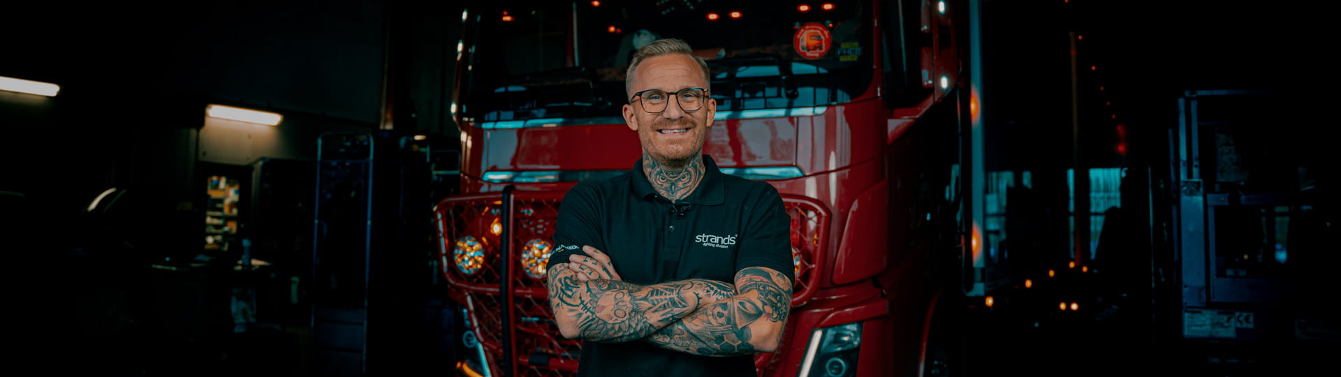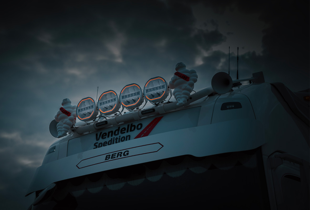 Hela min lastbil är monterad med belysning från Strands Lighting Division. Jag har extraljuset Siberia Skylord White, (Art. Nr. 270949) med Xperience-läge funktion. Jag använder Dark Knight Fortex ( Art Nr. 809255) där jag behöver extra arbetsbelysning arbetsljus.