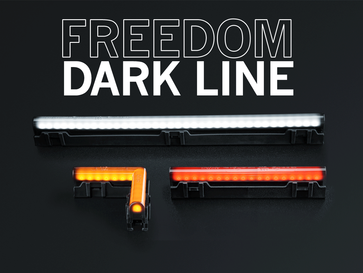 The Freedom Dark Line is a new take on the fiber optic look, with long (Part No. 900047-49), short (Part No. 900044-46), and corner (Part No. 900041-43) position lights manufactured in Europe. Get creative with your styling ideas and accentuate all those corners and angles with intense illumination. The dark lens will blend almost invisibly with darker trucks and draw attention on lighter color trucks. All sizes are available as side markers and front and back position lights. Only your imagination will set the limit with the Dark Line. As a bonus, the Dark Line consumes only 2-3W, so you can install as many as you like.