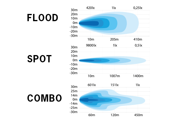 Combo. En kombinationsljusbild med inslag av både spot och fjärr. Ett bra all-round ljus för dig som kör på allt från små landsvägar till långdistanskörning på motorväg.